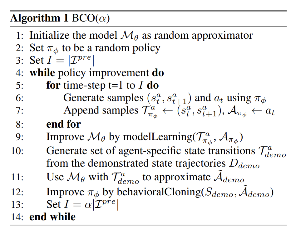 \[(s_t, s_{t+1}) \rightarrow a_t\]BCO is essentially a meta-algorithm to perform imitation learning when we only have access to state observations. Below is its pseudocode: